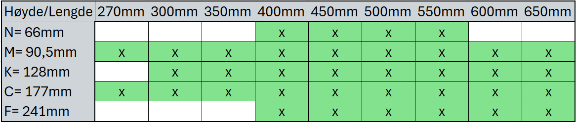 Under ser du en samleoversikt som viser hvilke høyder som passer med hvilke lengder. Skinner kan legges til ved behov.